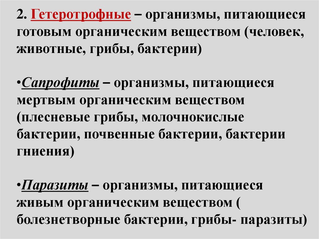 2. Гетеротрофные – организмы, питающиесяготовым органическим веществом (человек,