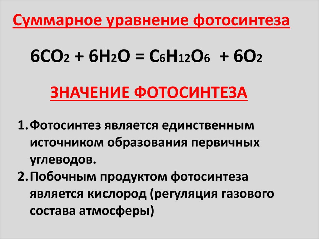 Суммарное уравнение фотосинтеза6СО2 + 6Н2О = С6Н12О6 + 6О2