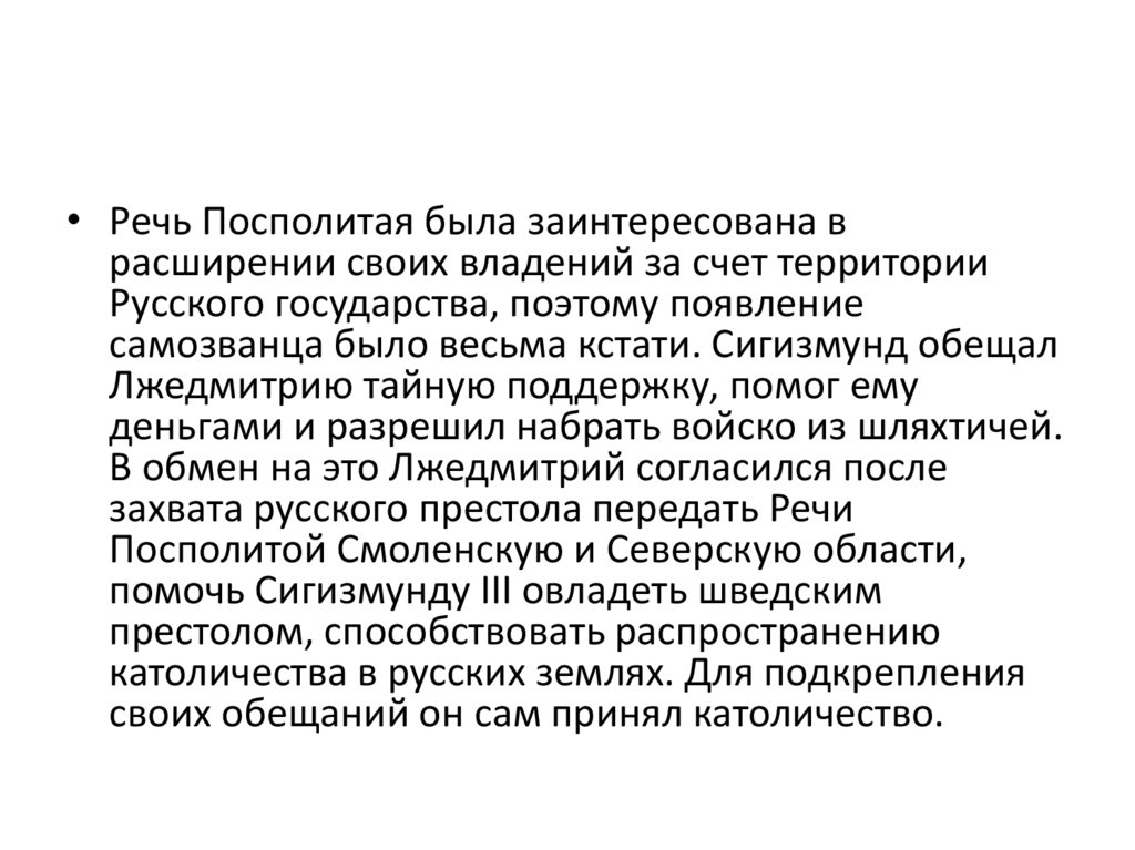 • Речь Посполитая была заинтересована врасширении своих владений за счет территории