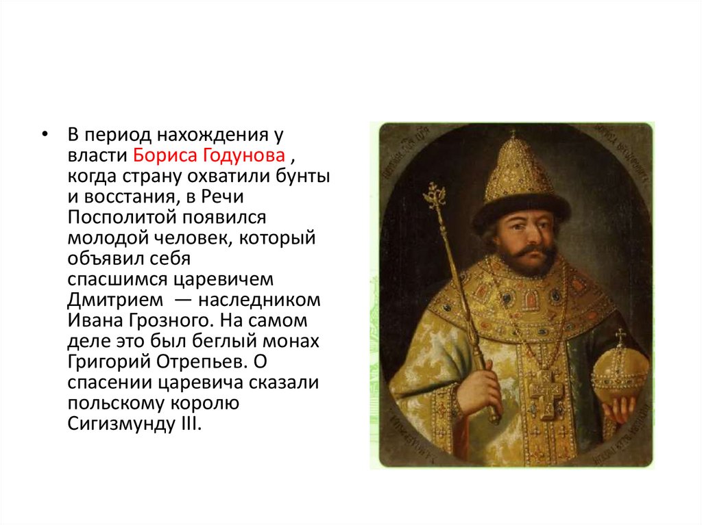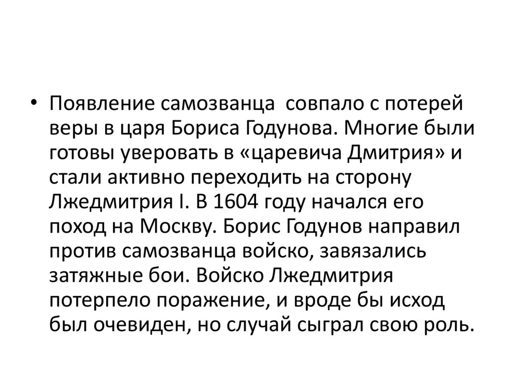 • Появление самозванца совпало с потерейверы в царя Бориса Годунова. Многие были