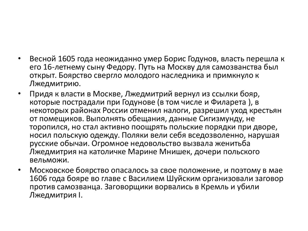 • Придя к власти в Москве, Лжедмитрий вернул из ссылки бояр,