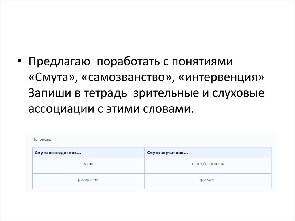 • Предлагаю поработать с понятиями«Смута», «самозванство», «интервенция»