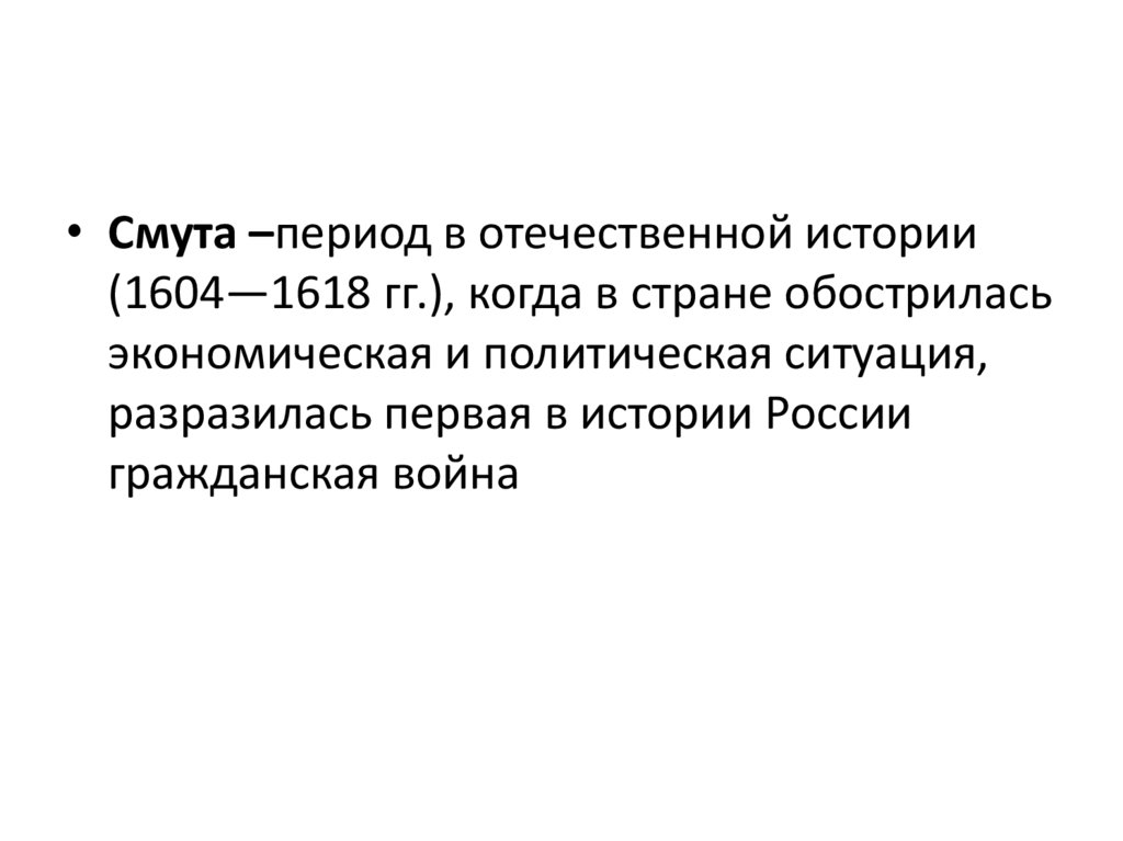 • Смута –период в отечественной истории(1604—1618 гг.), когда в стране обострилась