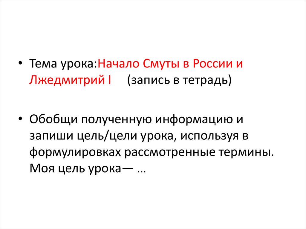 • Тема урока:Начало Смуты в России иЛжедмитрий I (запись в тетрадь)