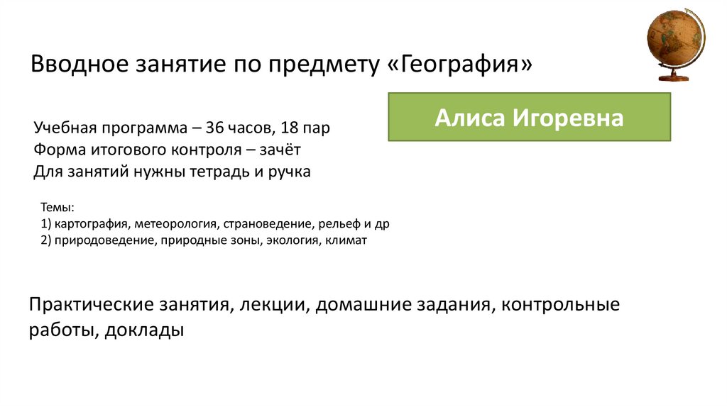 Вводное занятие по предмету «География»Учебная программа – 36 часов, 18 пар