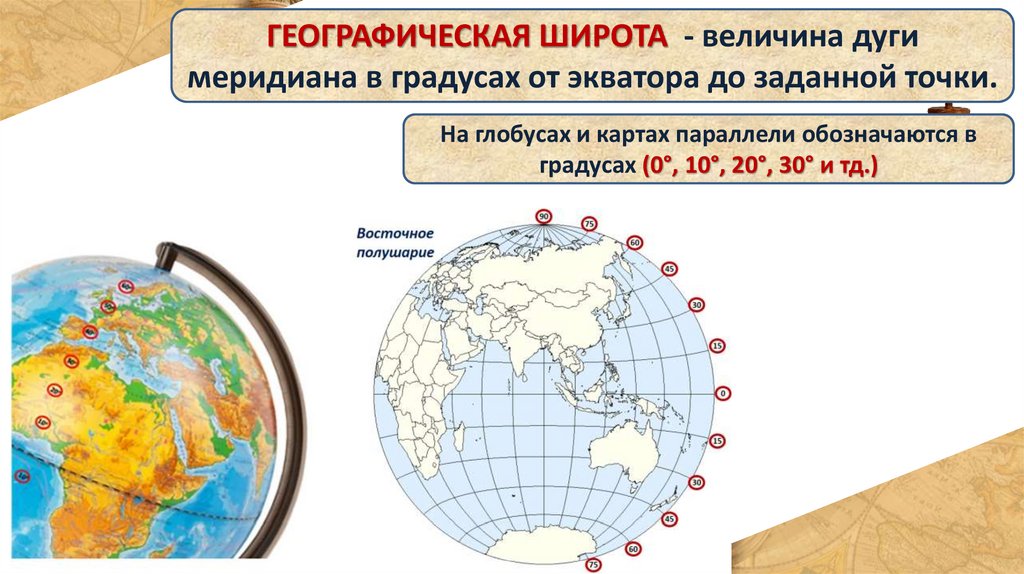 ГЕОГРАФИЧЕСКАЯ ШИРОТА - величина дугимеридиана в градусах от экватора до заданной точки.