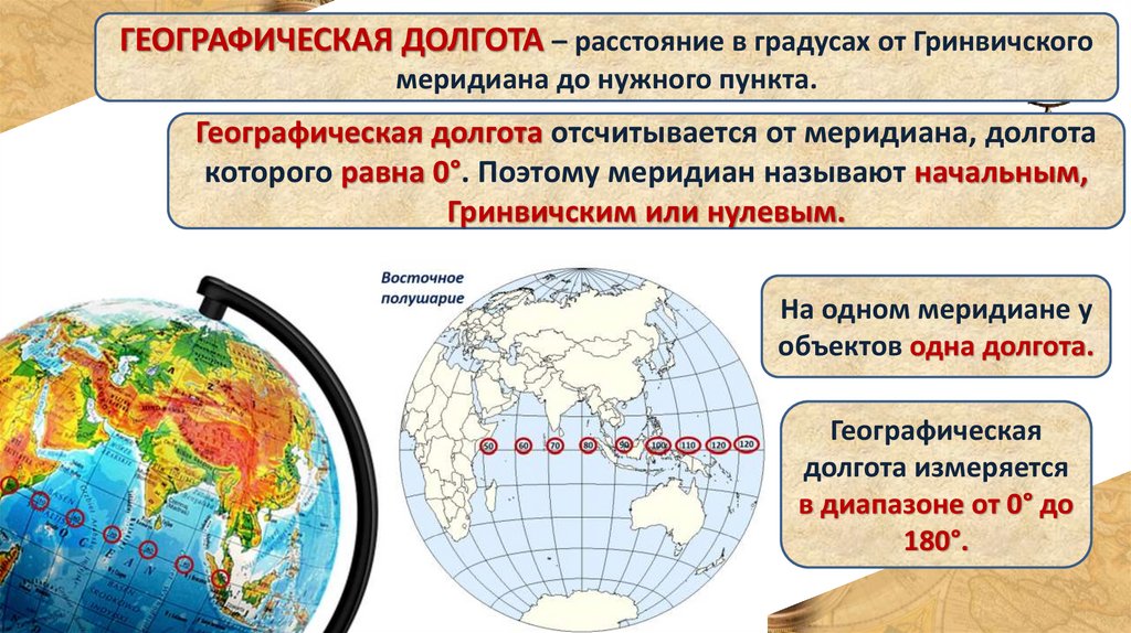ГЕОГРАФИЧЕСКАЯ ДОЛГОТА – расстояние в градусах от Гринвичскогомеридиана до нужного пункта.