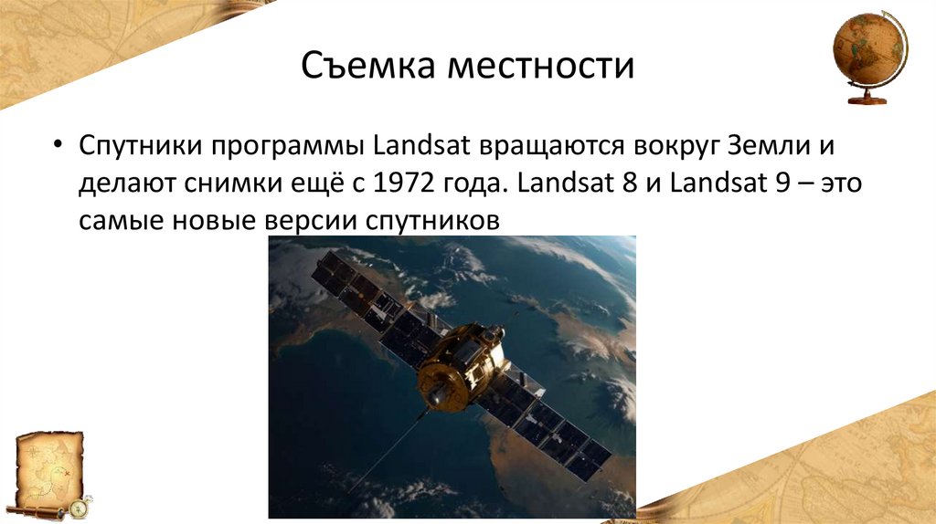Съемка местности• Спутники программы Landsat вращаются вокруг Земли и