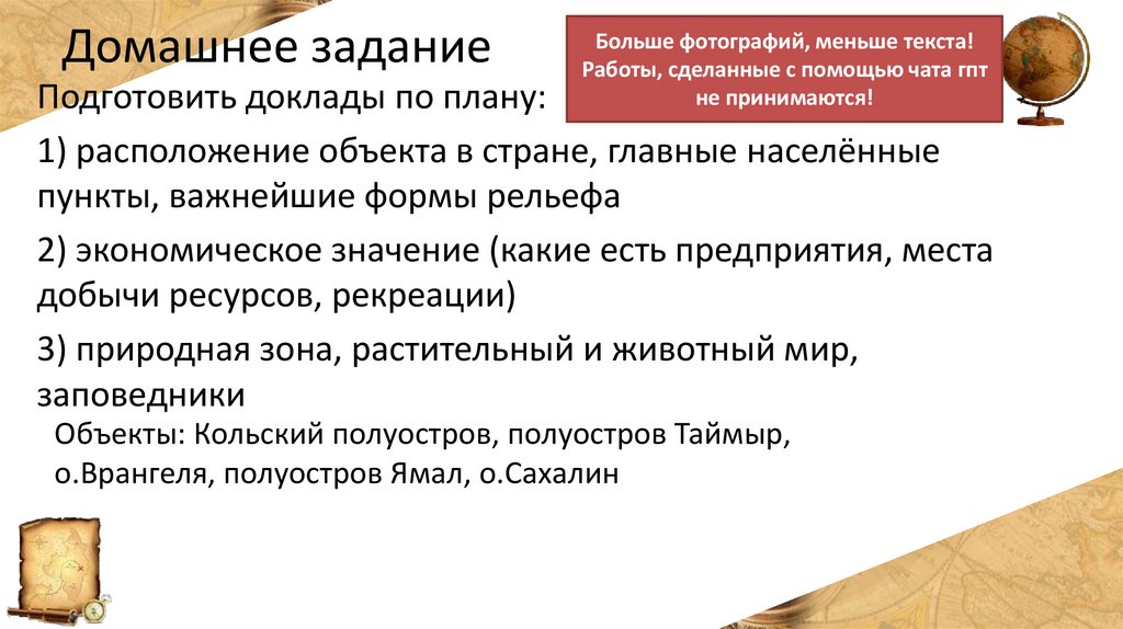 Объекты: Кольский полуостров, полуостров Таймыр,