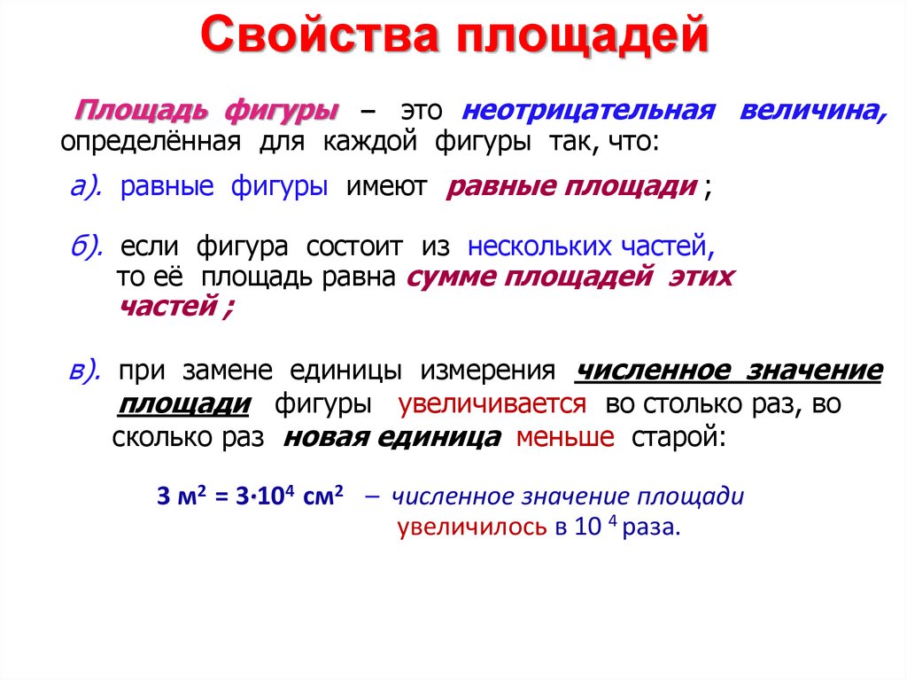Свойства площадейПлощадь фигуры – это неотрицательная величина,