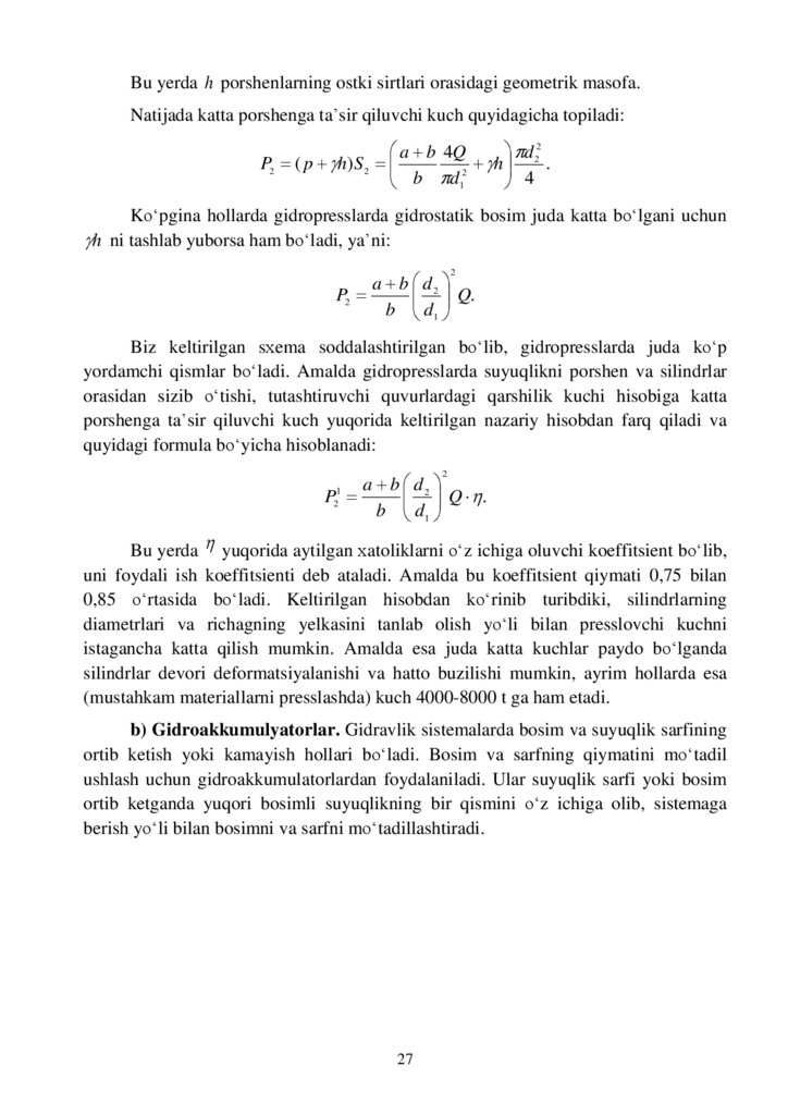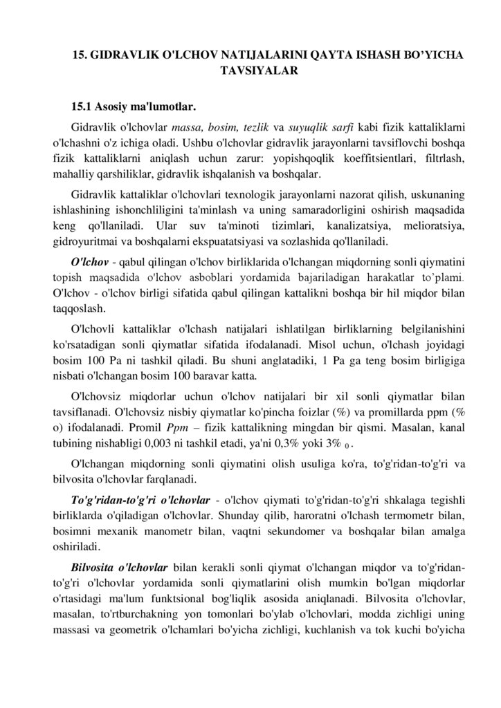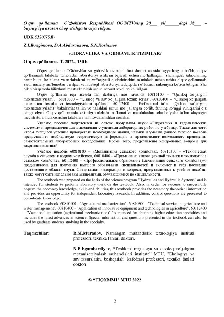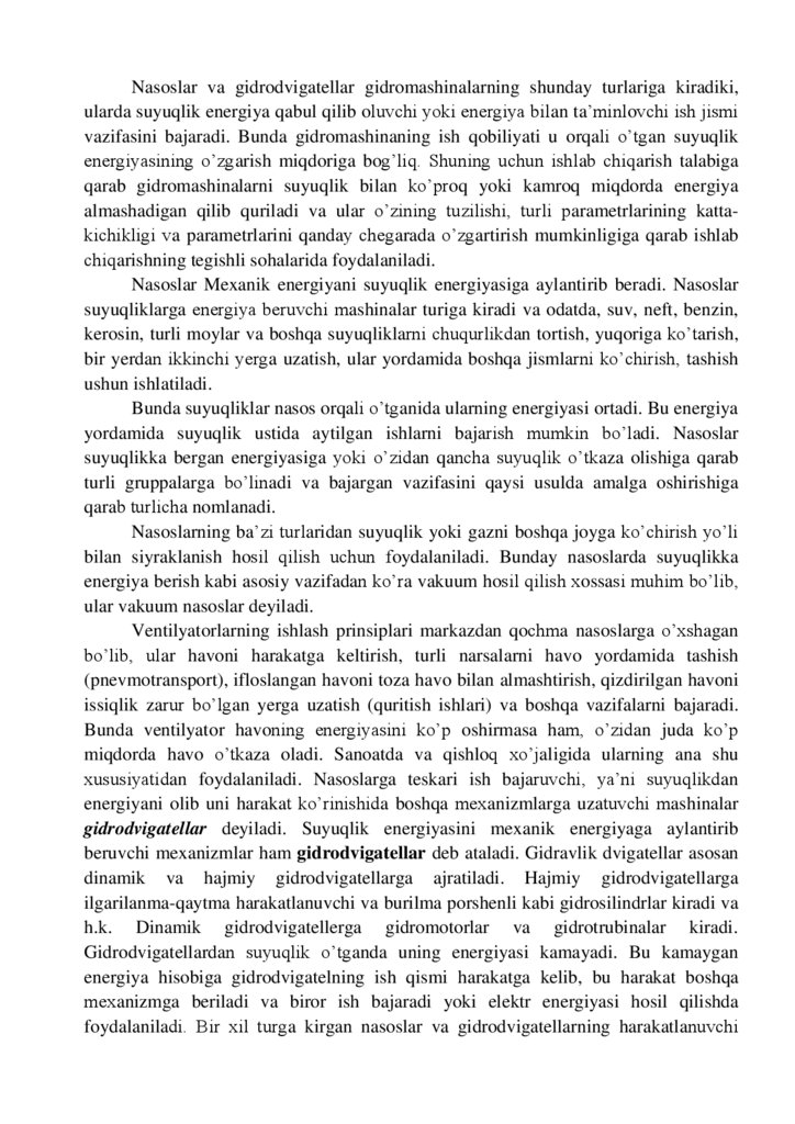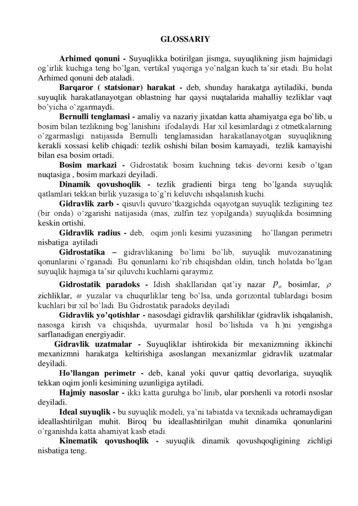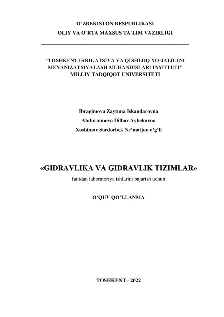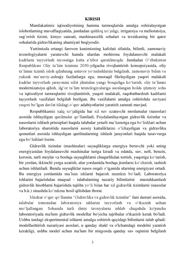 Mazkur o’quv qo’llanma “Gidravlika va gidravlik tizimlar” fani dasturi asosida,
