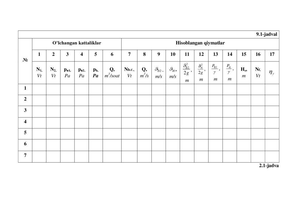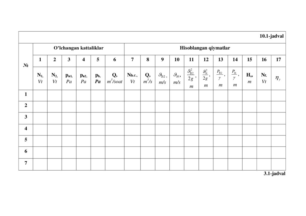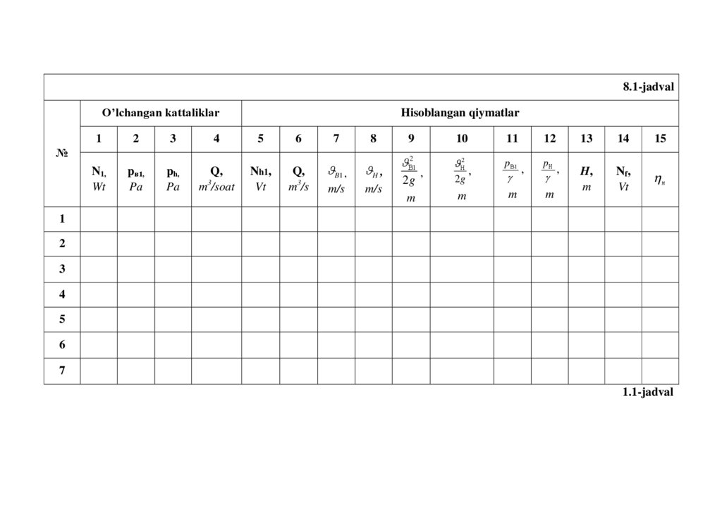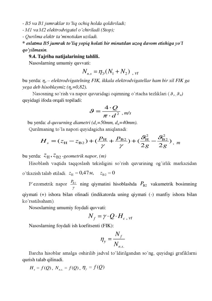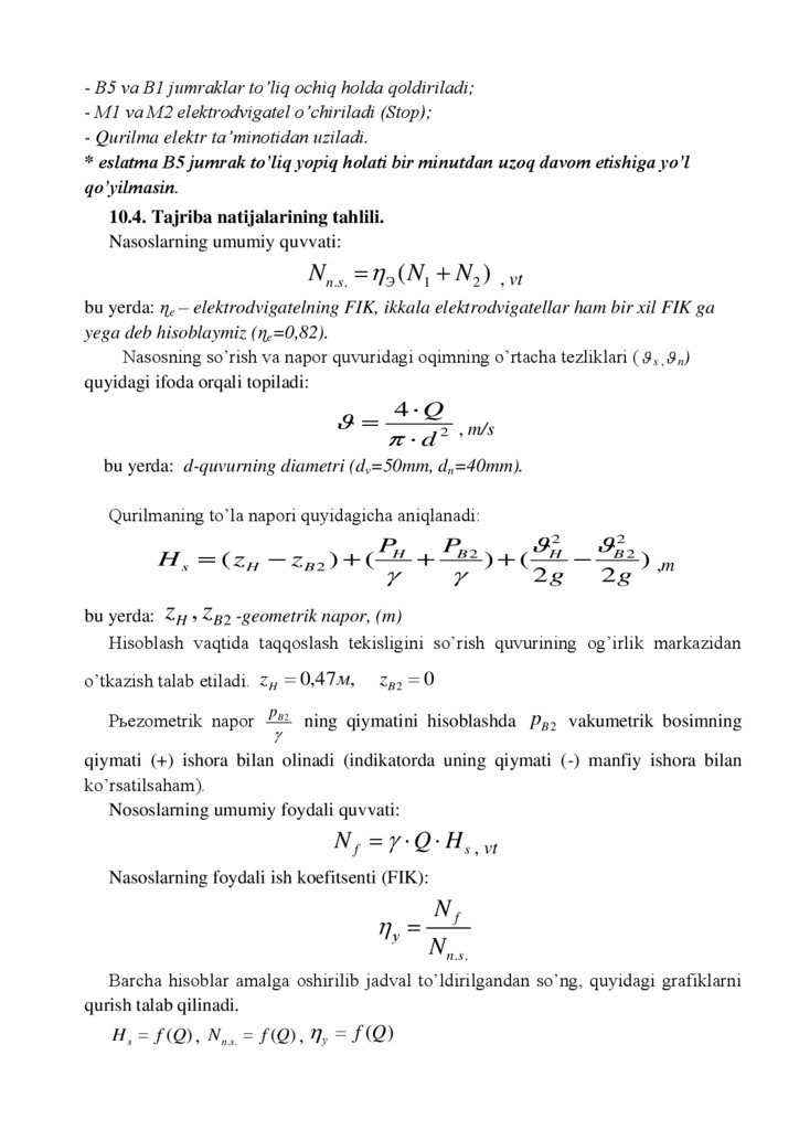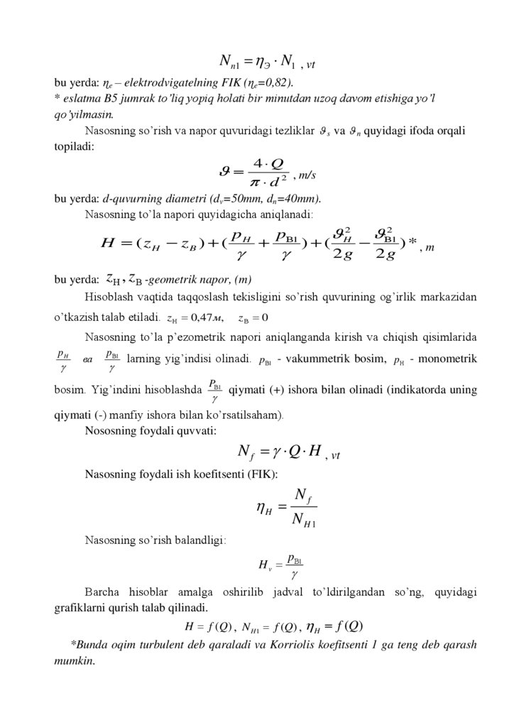 gidravlik hisoblarni bajarishda tajriba yo‘li bilan har хil gidravlik tizimlarni (nasoslar