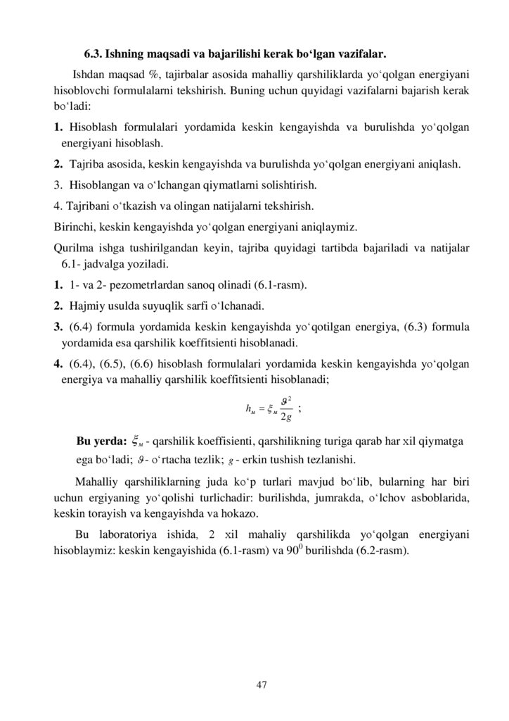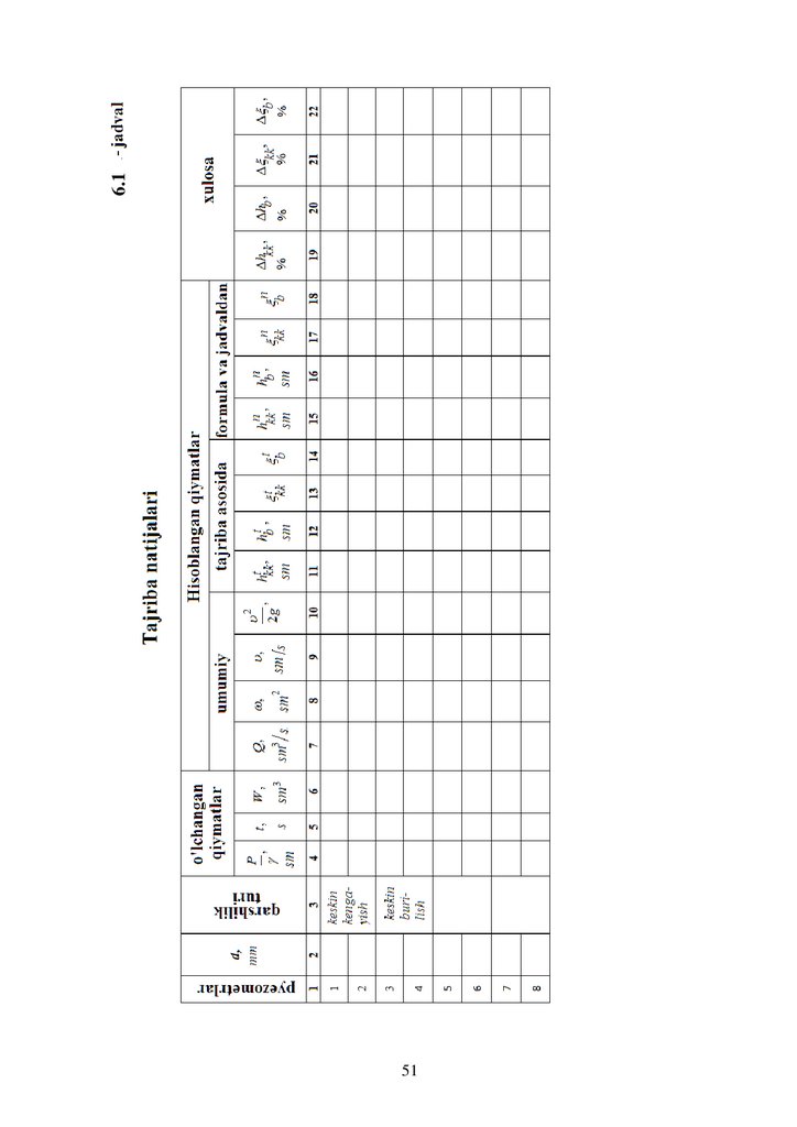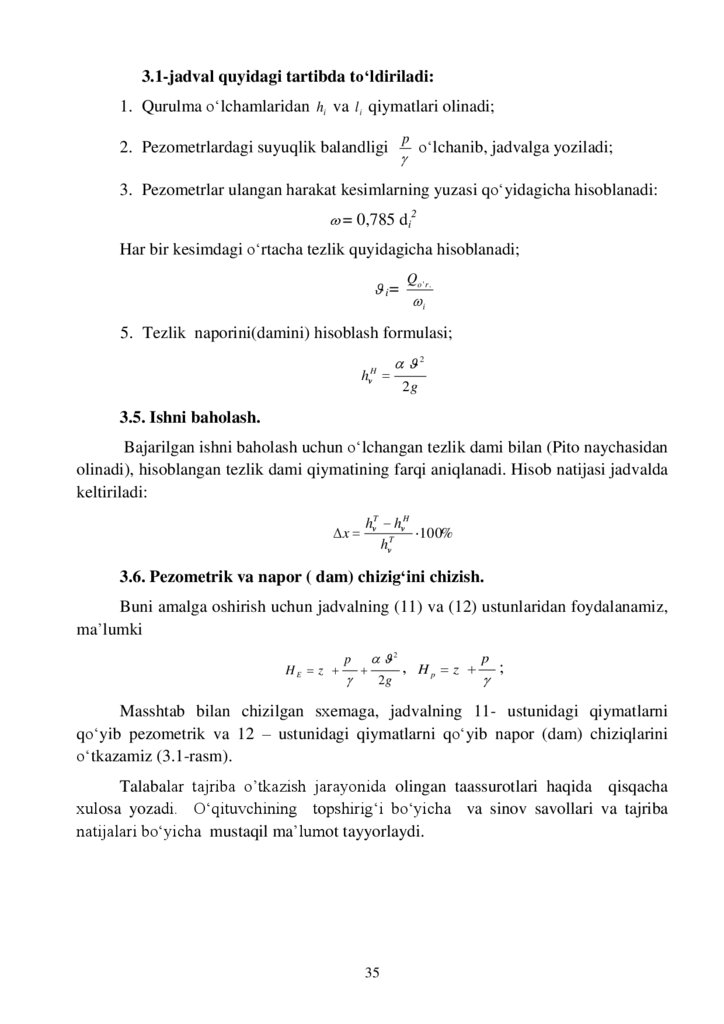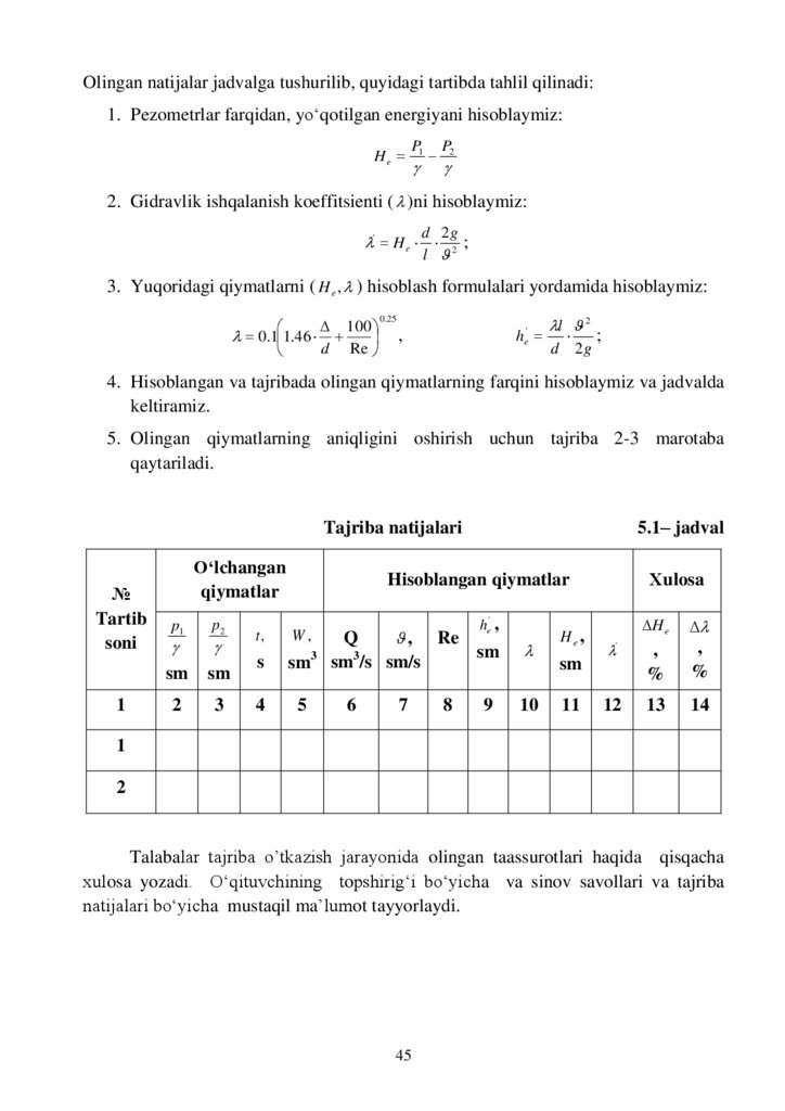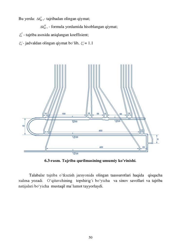 gidravlik hisoblarni bajarishda tajriba yo‘li bilan har хil gidravlik tizimlarni (nasoslar