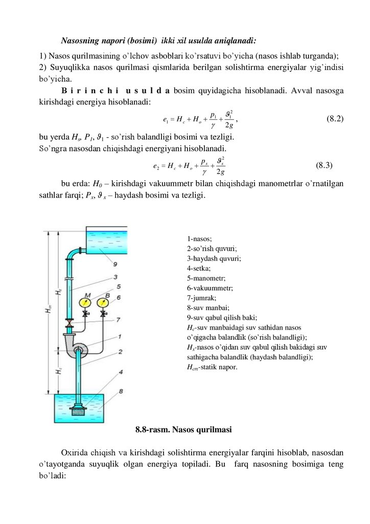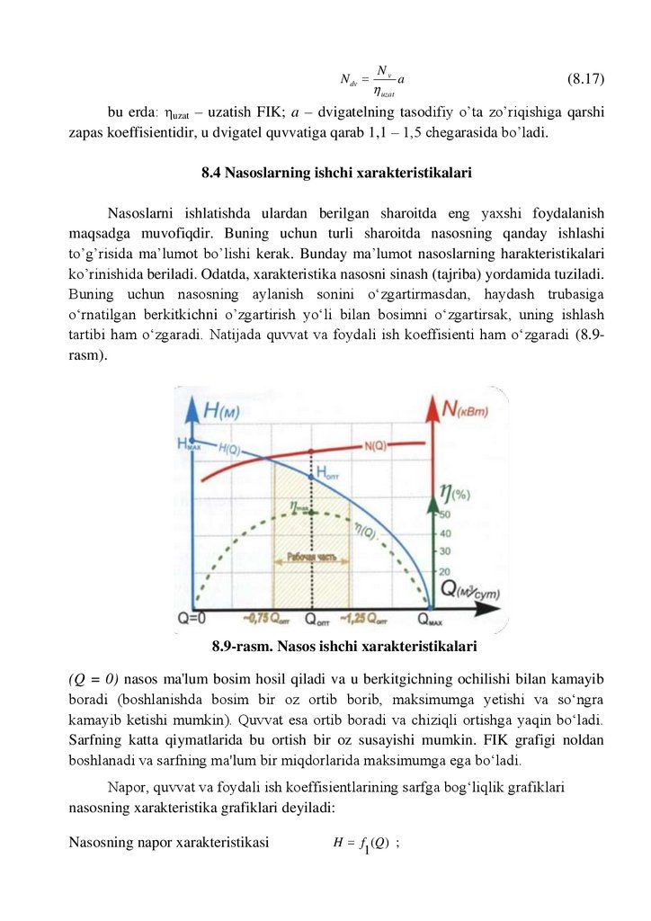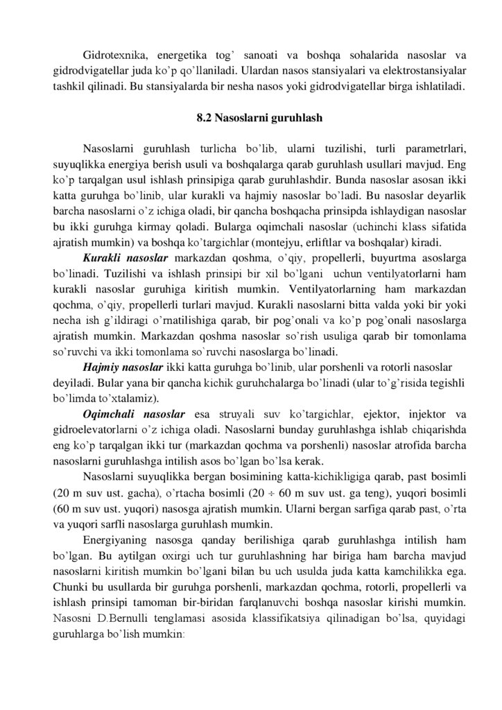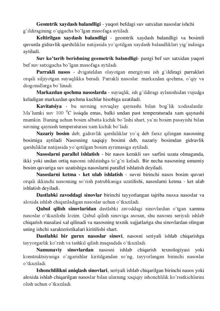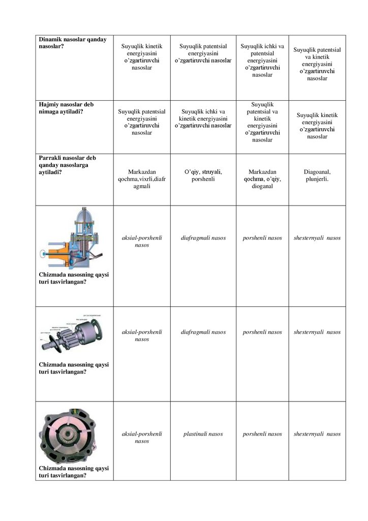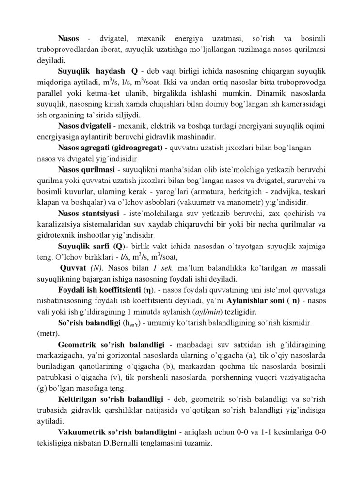 nasoslarni ishlash prinsiplari haqida talabalar yetarli ma’lumotga ega bo‘lishlari uchun