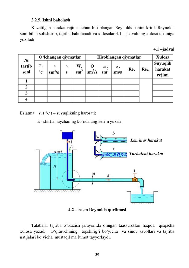 Oqim harakat tartibi (rejimi)ni tadqiqoti. Reynolds sonini