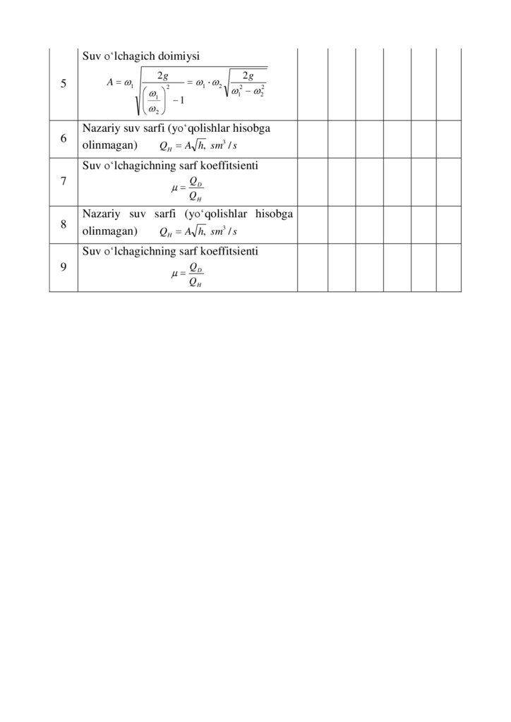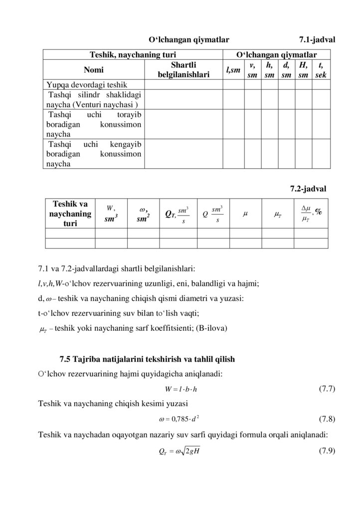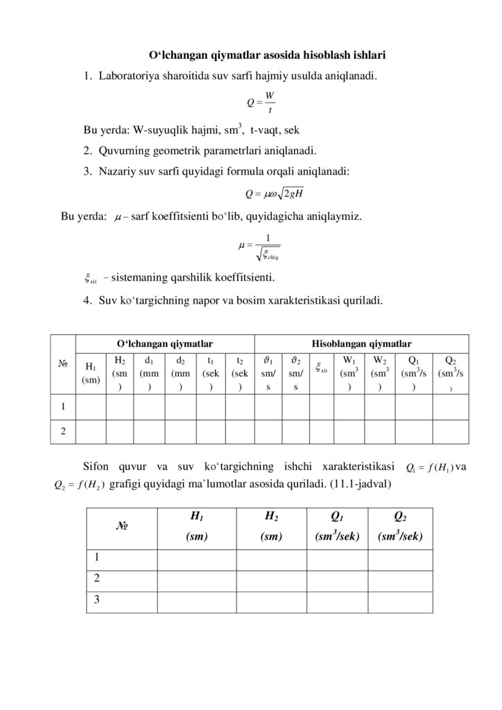 laboratoriyada ma'lum gidravlik modellar bo'yicha tajribalar o'tkazish kerak bo'ladi.
