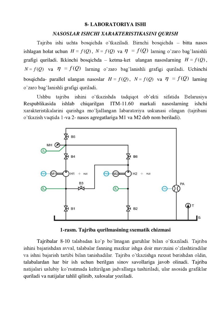laboratoriya sharoitida nasoslarni asosiy kattaliklarini o‘lchaydigan va gidravlika