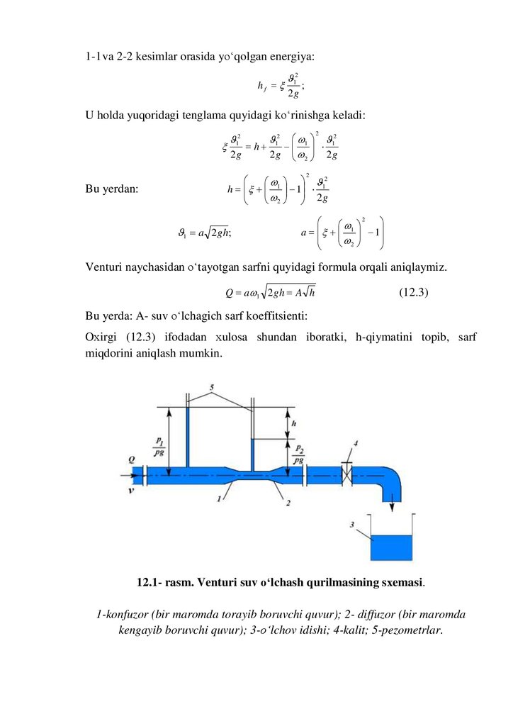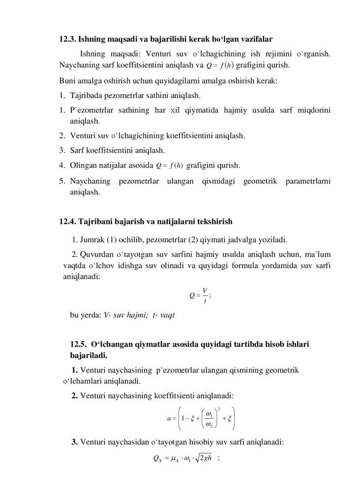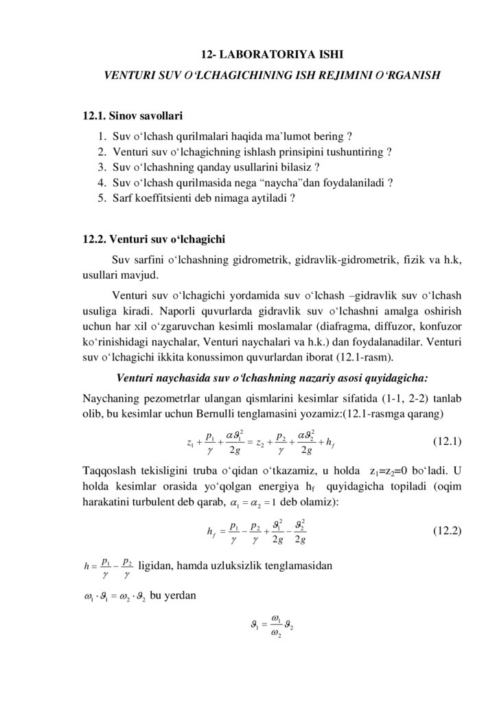 12-LAB. Venturi suv o‘lchagichining ish rejimini o‘rganish