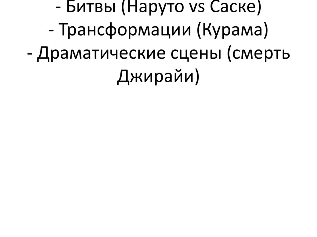 - Битвы (Наруто vs Саске)- Трансформации (Курама)