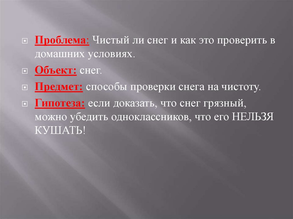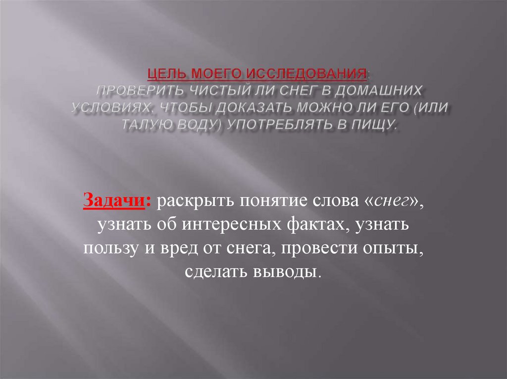 2. Цель моего исследования: проверить чистый ли снег в домашних условиях, чтобы доказать можно ли его (или талую воду) употреблять