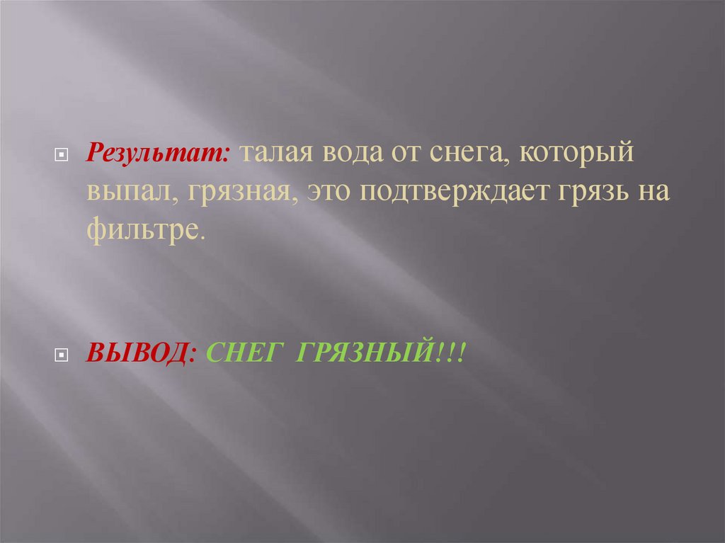 Результат: талая вода от снега, которыйвыпал, грязная, это подтверждает грязь на