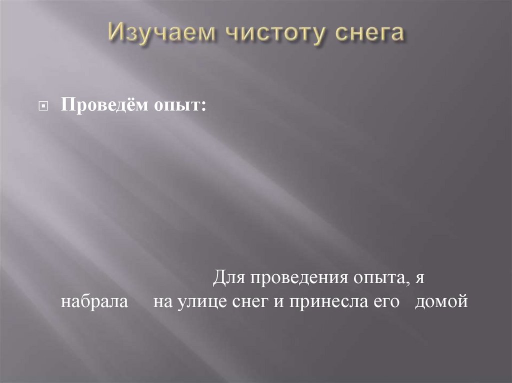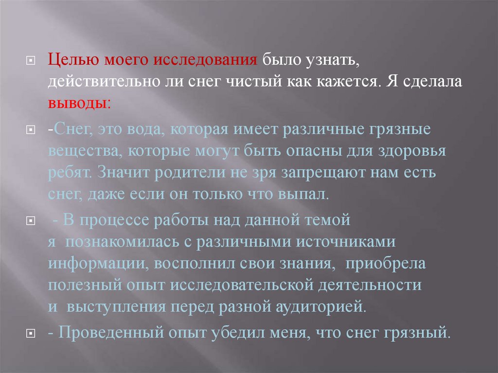 Целью моего исследования было узнать,действительно ли снег чистый как кажется. Я сделала