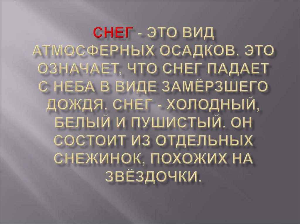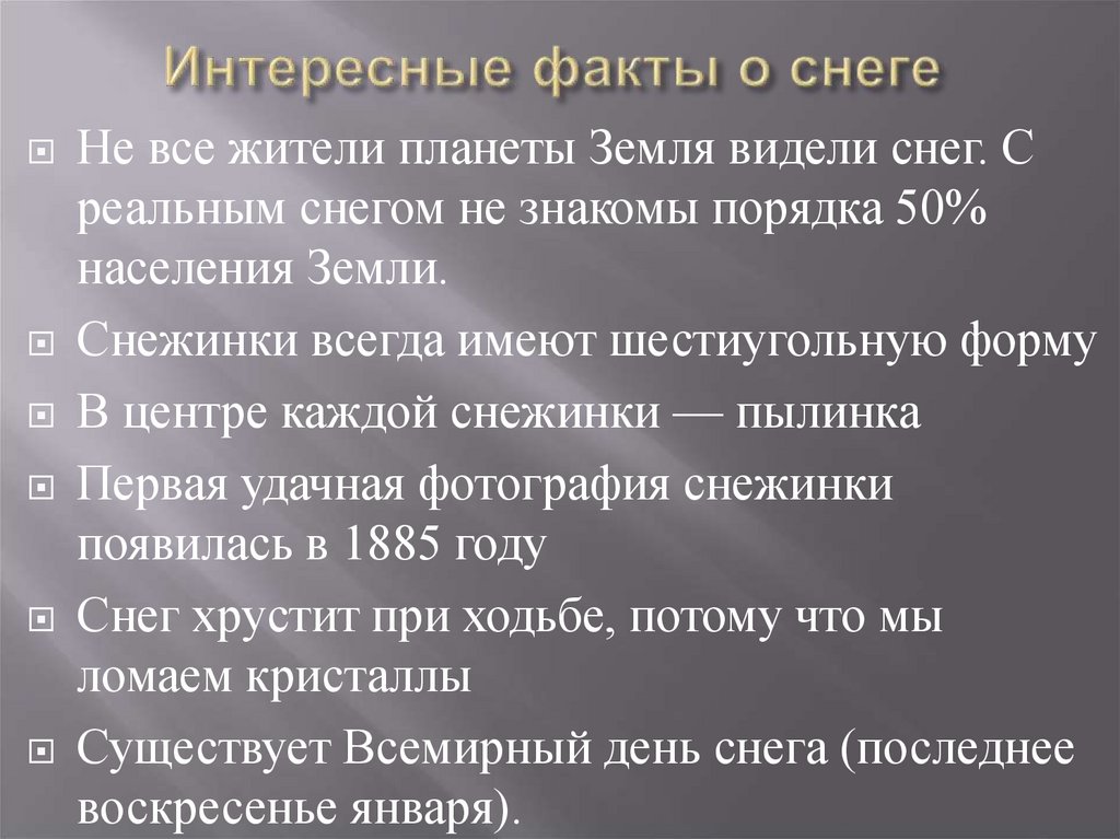 Задачи: раскрыть понятие слова «снег»,узнать об интересных фактах, узнать