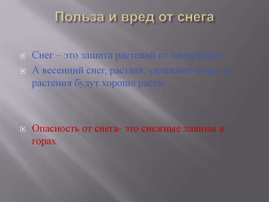 Снег – это защита растений от замерзания.А весенний снег, растаяв, увлажнит почву, и