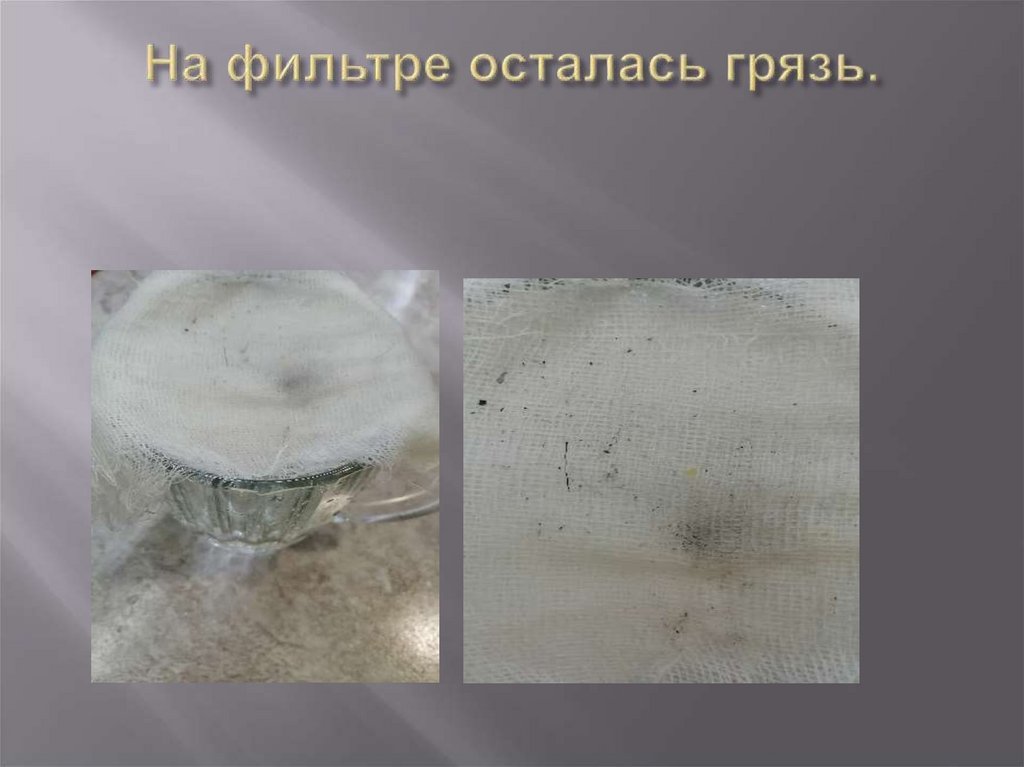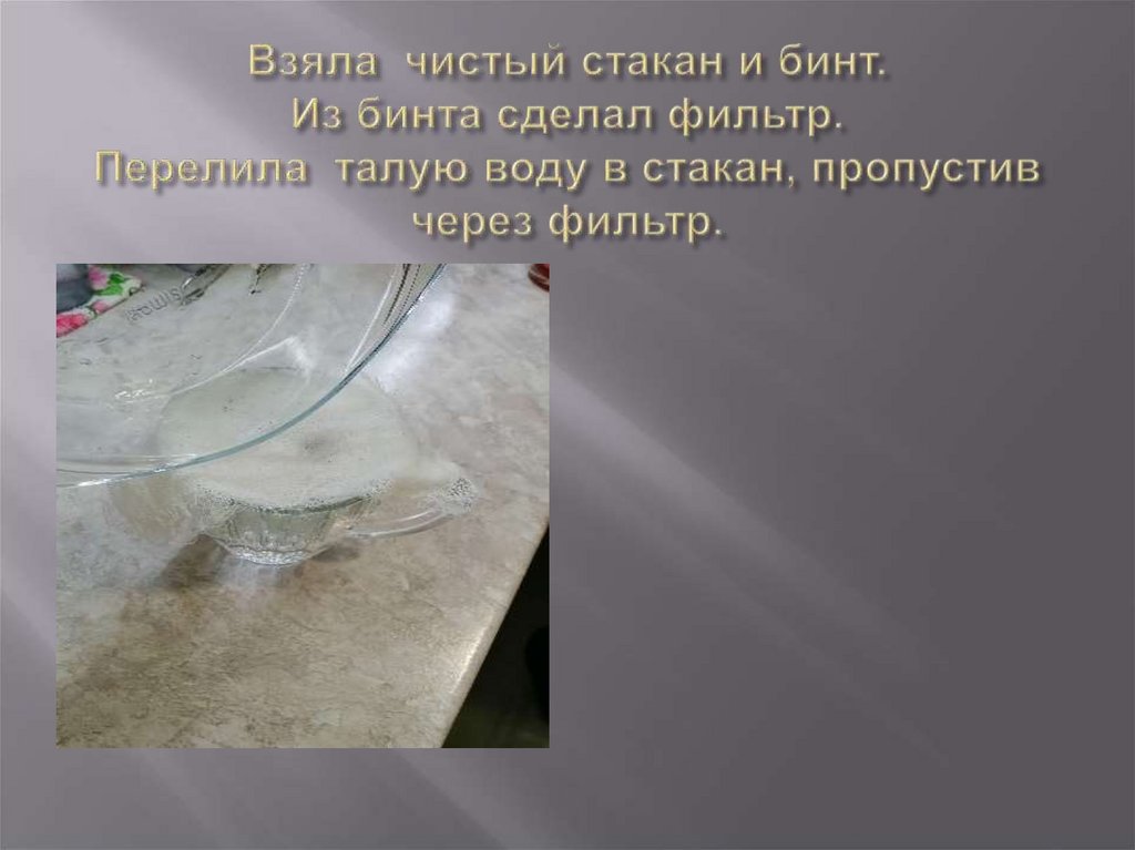 9. Взяла чистый стакан и бинт. Из бинта сделал фильтр. Перелила талую воду в стакан, пропустив через фильтр.