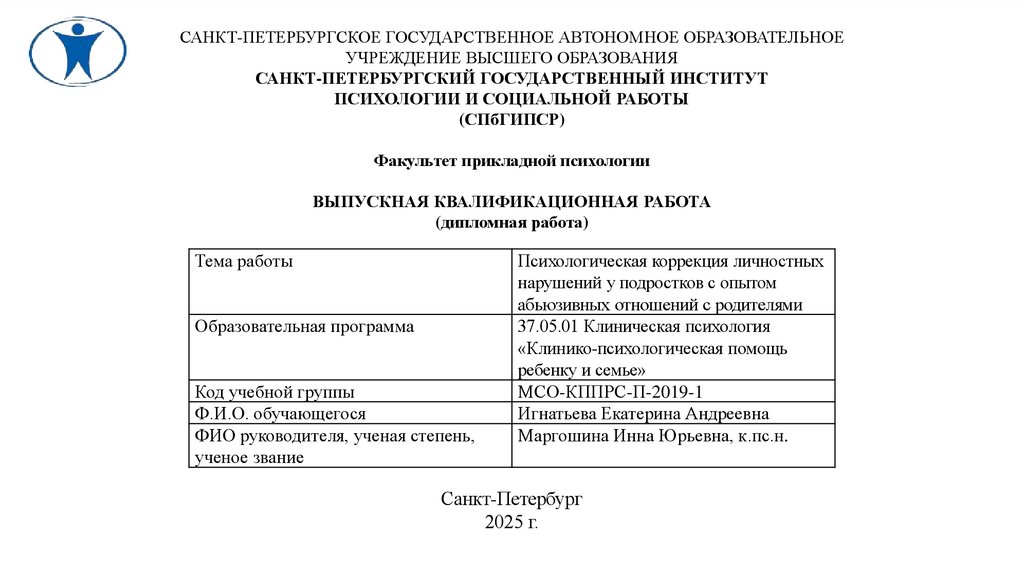 САНКТ-ПЕТЕРБУРГСКОЕ ГОСУДАРСТВЕННОЕ АВТОНОМНОЕ ОБРАЗОВАТЕЛЬНОЕУЧРЕЖДЕНИЕ ВЫСШЕГО ОБРАЗОВАНИЯ