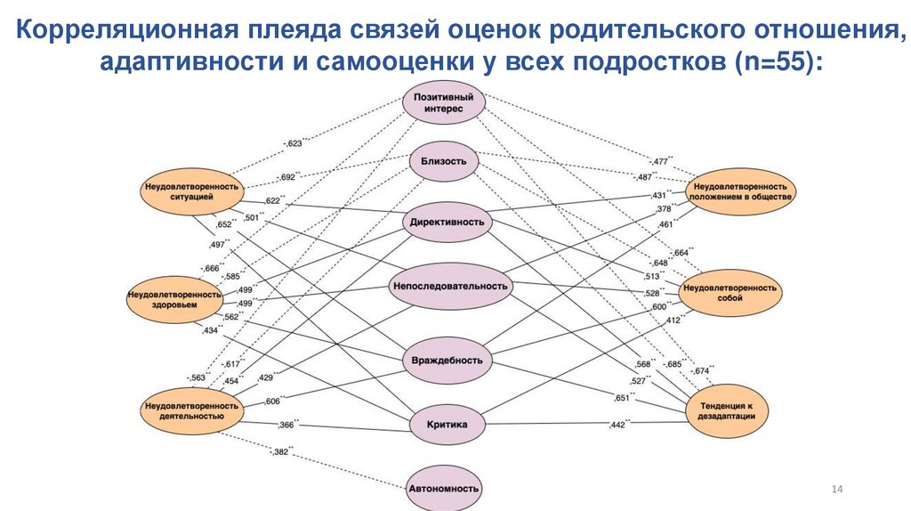 Корреляционная плеяда связей оценок родительского отношения,адаптивности и самооценки у всех подростков (n=55):