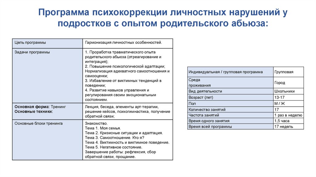 Программа психокоррекции личностных нарушений уподростков с опытом родительского абьюза:
