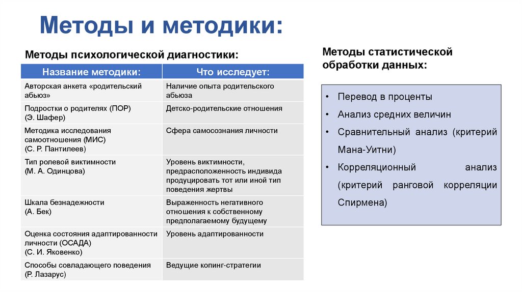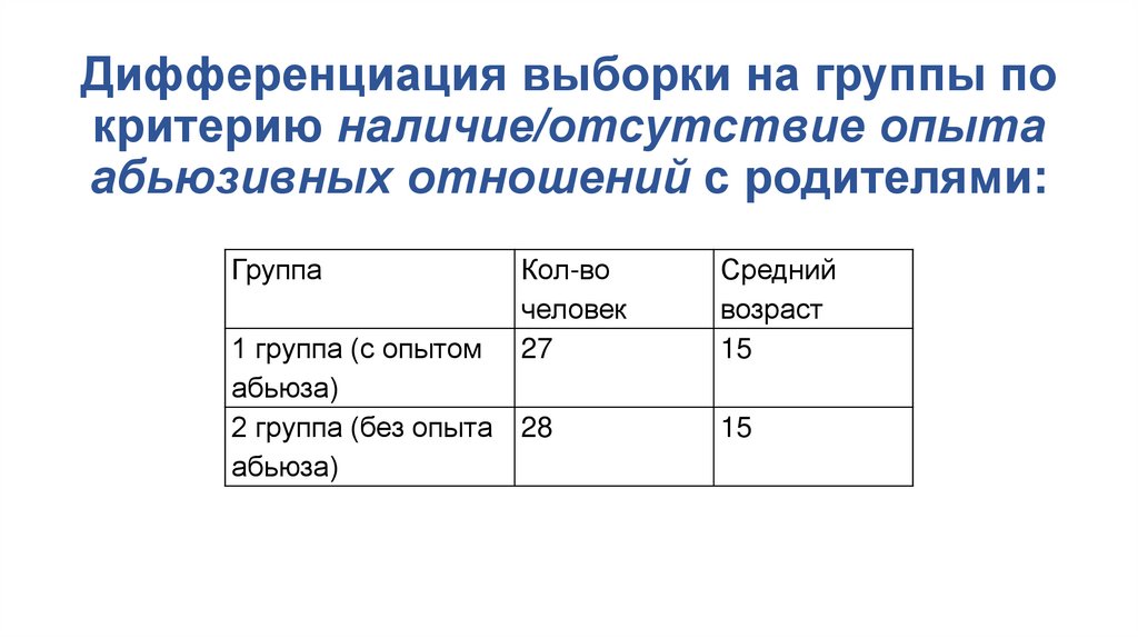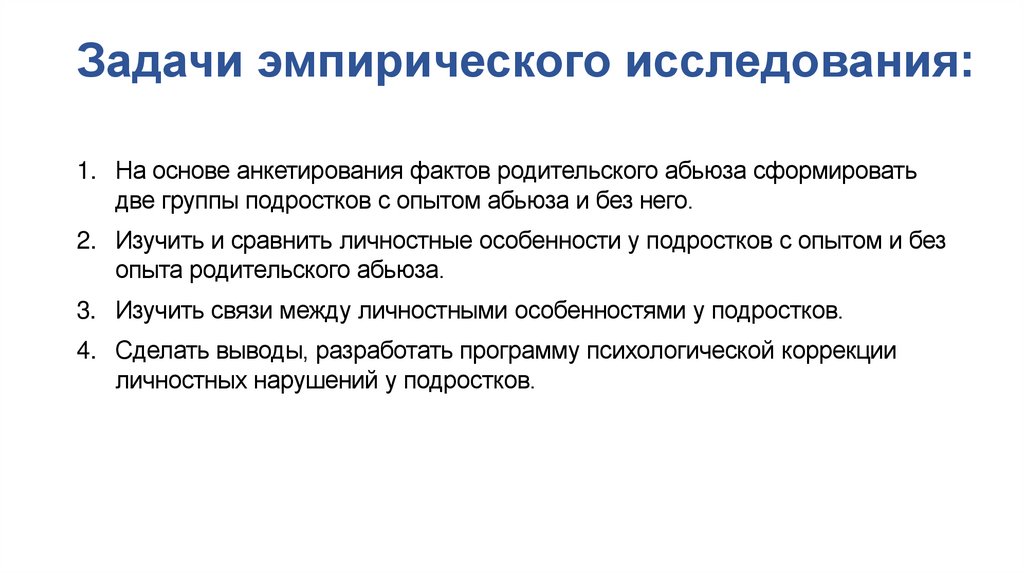 Задачи эмпирического исследования:1. На основе анкетирования фактов родительского абьюза сформировать