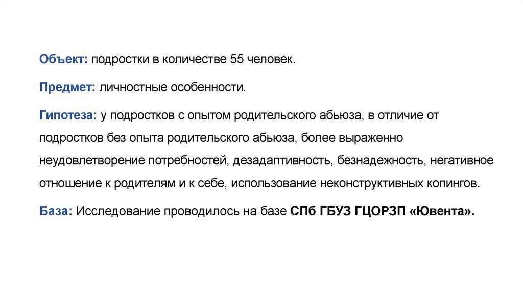 Объект: подростки в количестве 55 человек.Предмет: личностные особенности.