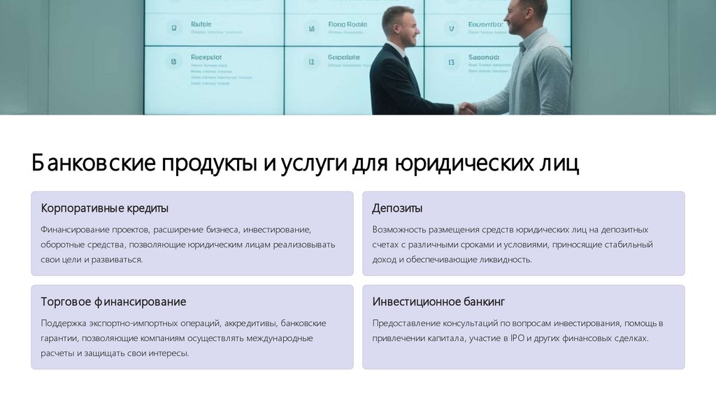 1) прием депозитов, открытие и ведение банковских счетов юридических лиц;