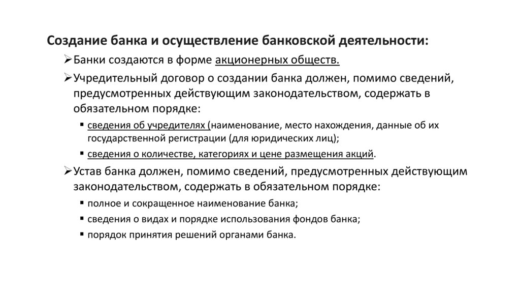 Создание банка и осуществление банковской деятельности:Банки создаются в форме акционерных обществ.