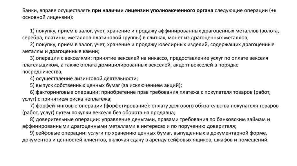 Банки, вправе осуществлять при наличии лицензии уполномоченного органа следующие операции (+косновной лицензии):