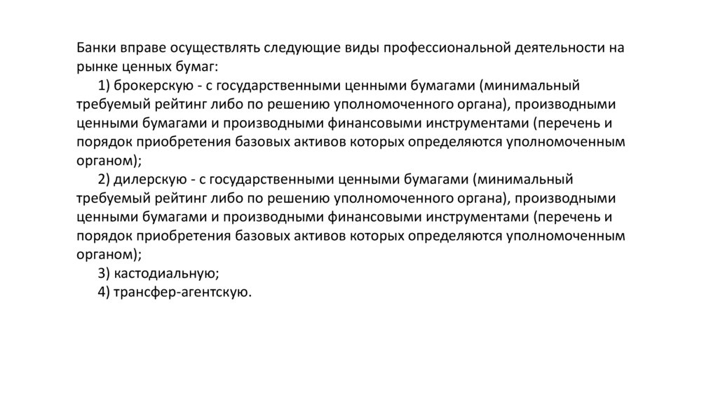 Банки вправе осуществлять следующие виды профессиональной деятельности нарынке ценных бумаг:
