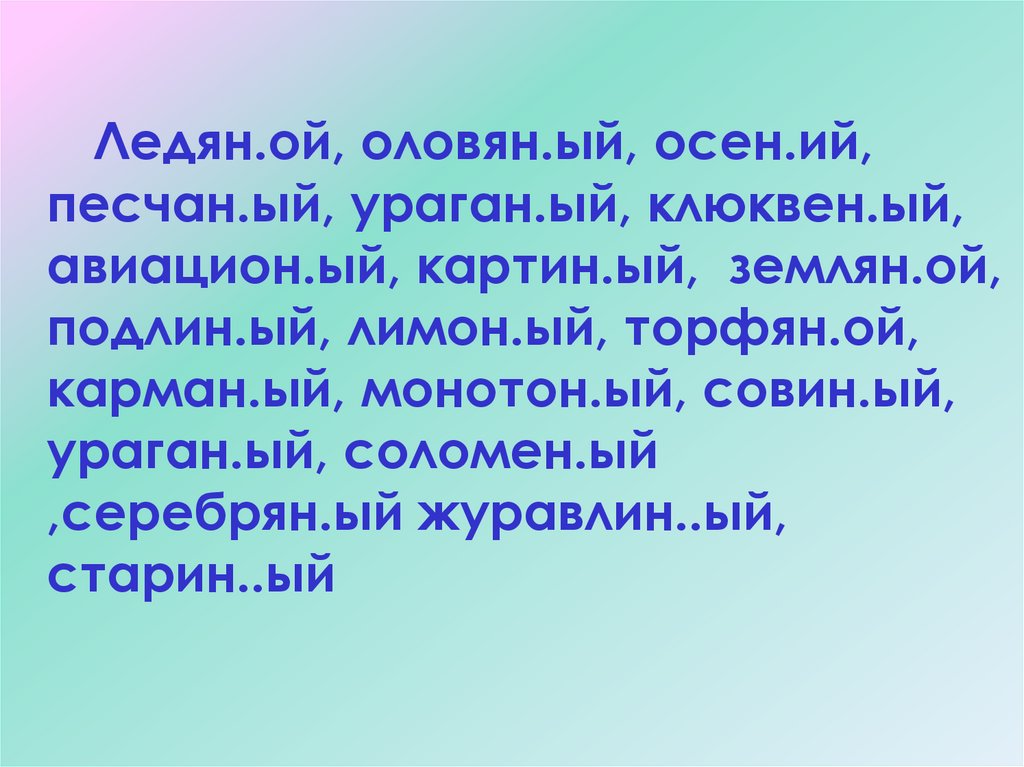 Ледян.ой, оловян.ый, осен.ий,песчан.ый, ураган.ый, клюквен.ый,