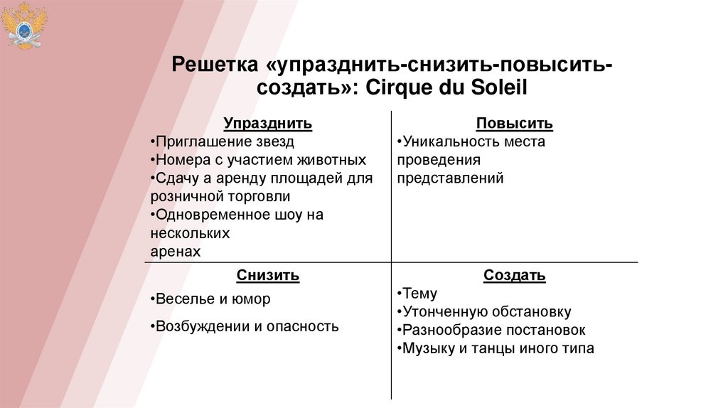 Решетка «упразднить-снизить-повыситьсоздать»: Cirque du SoleilУпразднить