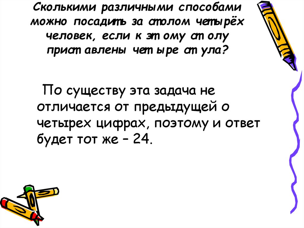 Сколькими различными способамиможно посадит ь за ст олом чет ырёх