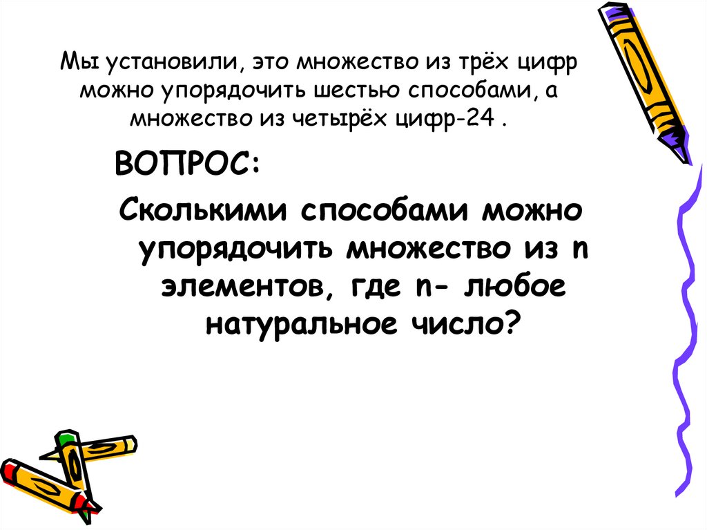 Мы установили, это множество из трёх цифрможно упорядочить шестью способами, а