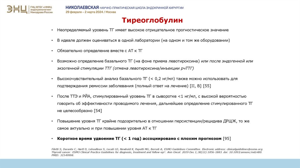 ТиреоглобулинНеопределяемый уровень ТГ имеет высокое отрицательное прогностическое значение