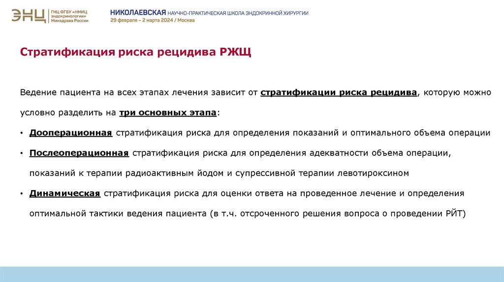 Стратификация риска рецидива РЖЩВедение пациента на всех этапах лечения зависит от стратификации риска рецидива, которую можно