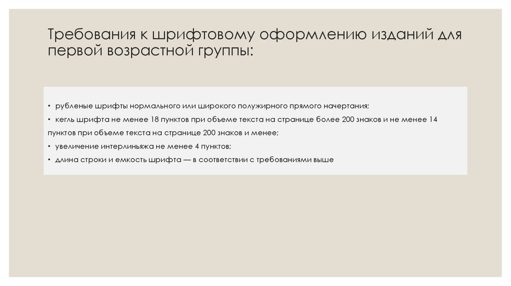 Требования к шрифтовому оформлению изданий дляпервой возрастной группы: