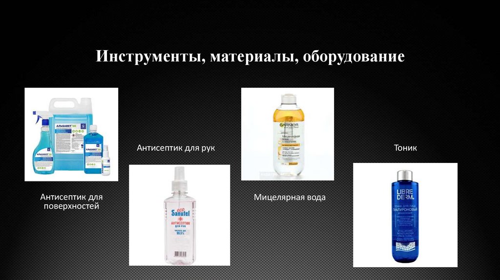 Инструменты, материалы, оборудованиеАнтисептик для рук