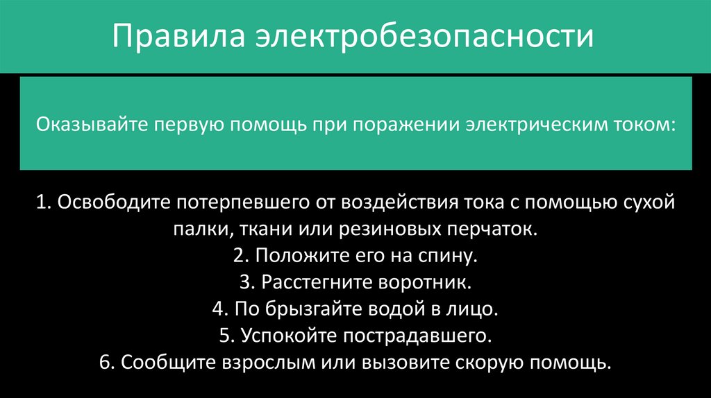 Правила электробезопасностиОказывайте первую помощь при поражении электрическим током: