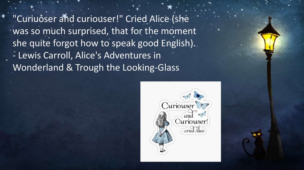 "Curiuoser and curiouser!" Cried Alice (shewas so much surprised, that for the moment
