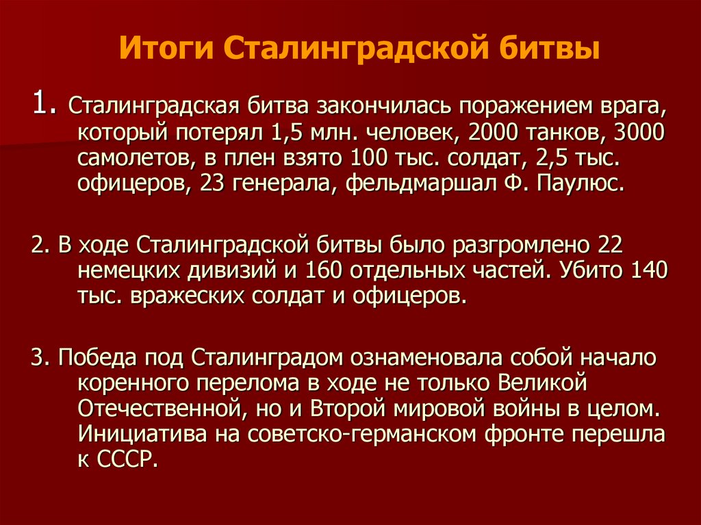 Итоги Сталинградской битвы1. Сталинградская битва закончилась поражением врага,