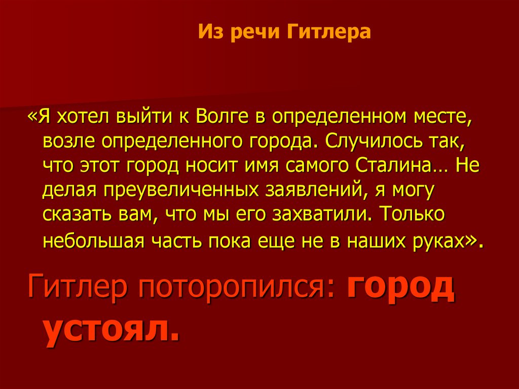 Из речи Гитлера«Я хотел выйти к Волге в определенном месте,